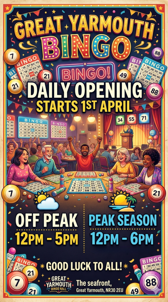 Join us for some exciting prize bingo! Come and experience the lively vibe of Great Yarmouth seafront, where coastal charm and a fun atmosphere guarantee a fantastic time. Nestled under the tower and right across from the Marina Centre, this spot boasts breathtaking views and exciting activities for everyone. Whether you’re taking a leisurely stroll along the promenade, tasting delicious local dishes, or soaking up the sunshine, Great Yarmouth is your perfect coastal getaway!