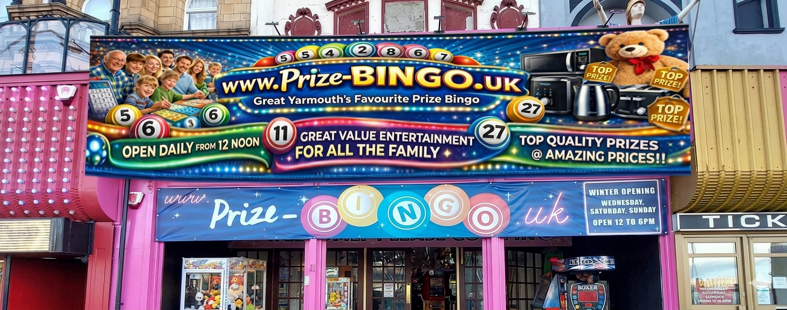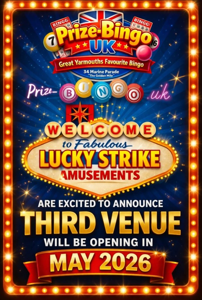 A new family friendly venue for Prize Bingo. Open Every Wednesday, Saturday and Sundays All winter @ 34 Marine Parade Great Yarmouth